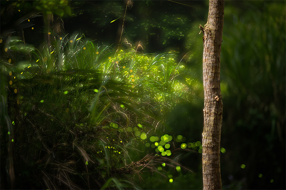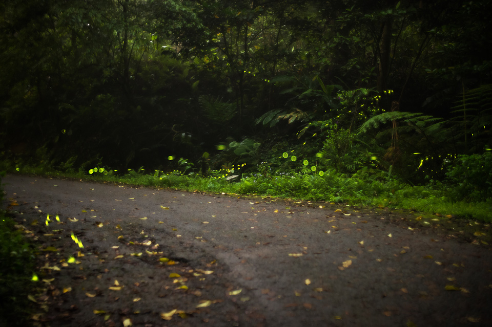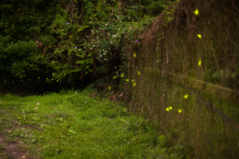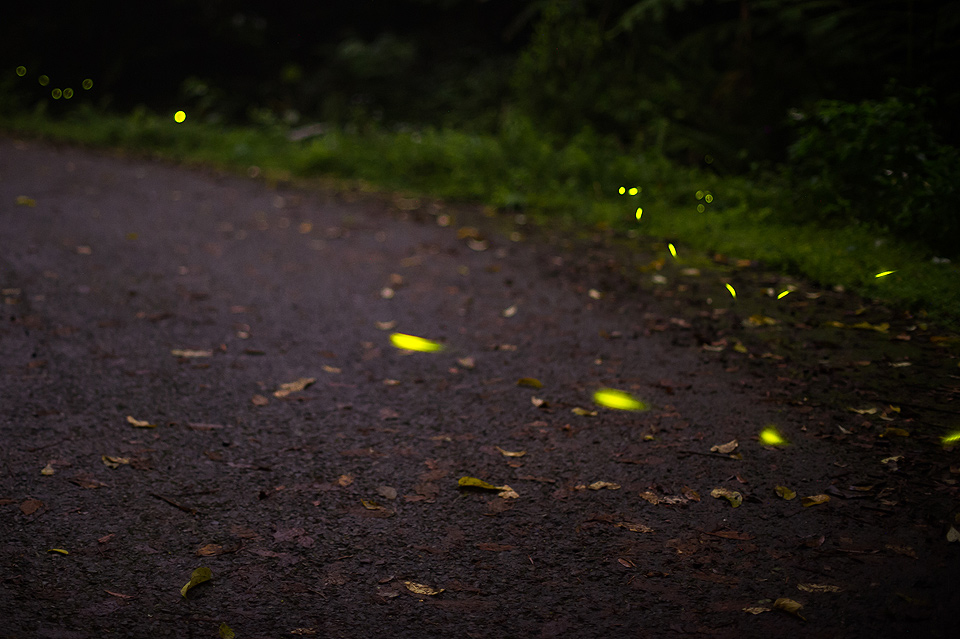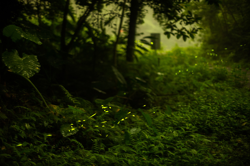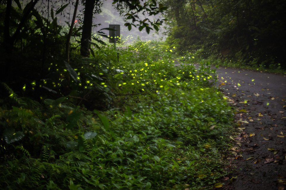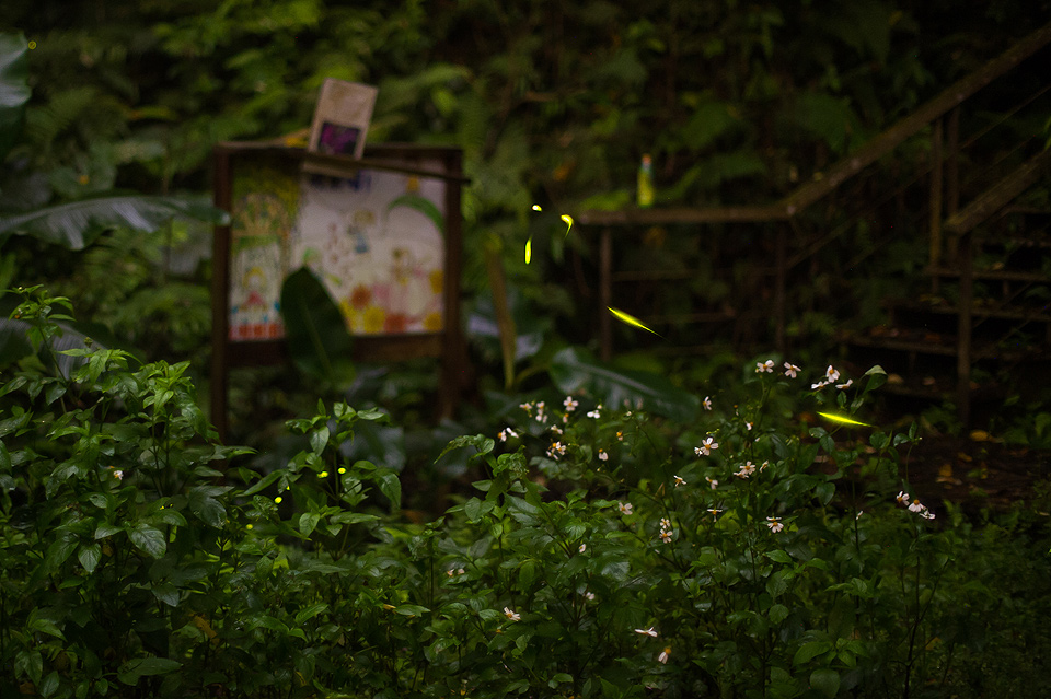 我在拍攝的時候發現螢火蟲的路徑有些規則,常常看到不同的螢火蟲重覆一樣的飛行的軌跡;從我身後飛進,慢慢的靠進階梯、盤旋兩下、上昇翻過護欄之類的,如果可以事先推敲出構圖中螢光路過的頻率,也許在環境條件嚴苛的情況下也還是能拍出不錯的照片。